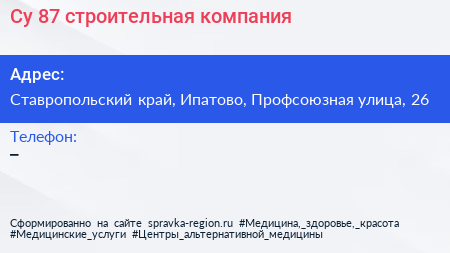 Су-87, строительная компания по адресу Ставропольский край, Ипатово, Профсоюзная улица, 26 в дальнейшем Организация, размещена в следующих категориях: