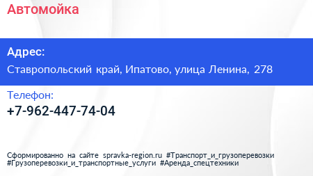 Автомойка по адресу Ставропольский край, Ипатово, улица Ленина, 278 в дальнейшем Организация, размещена в следующих категориях: