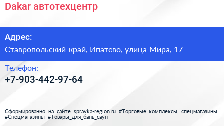 Dakar, автотехцентр по адресу Ставропольский край, Ипатово, улица Мира, 17 в дальнейшем Организация, размещена в следующих категориях: