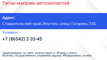 Титан, магазин автозапчастей по адресу Ставропольский край, Ипатово, улица Гагарина, 21Б в дальнейшем Организация, размещена в следующих категориях: