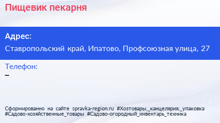 Пищевик, пекарня по адресу Ставропольский край, Ипатово, Профсоюзная улица, 27 в дальнейшем Организация, размещена в следующих категориях: