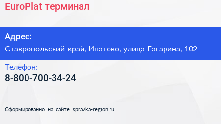EuroPlat, терминал по адресу Ставропольский край, Ипатово, улица Гагарина, 102 в дальнейшем Организация, размещена в следующих категориях: