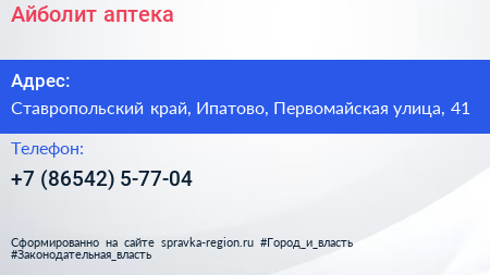Айболит, аптека по адресу Ставропольский край, Ипатово, Первомайская улица, 41 в дальнейшем Организация, размещена в следующих категориях: