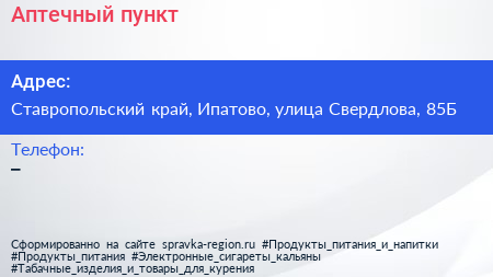 Аптечный пункт по адресу Ставропольский край, Ипатово, улица Свердлова, 85Б в дальнейшем Организация, размещена в следующих категориях: