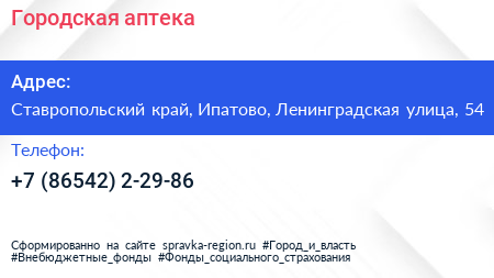 Городская аптека по адресу Ставропольский край, Ипатово, Ленинградская улица, 54 в дальнейшем Организация, размещена в следующих категориях: