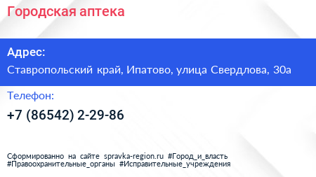 Городская аптека по адресу Ставропольский край, Ипатово, улица Свердлова, 30а в дальнейшем Организация, размещена в следующих категориях: