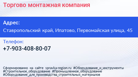 Торгово-монтажная компания по адресу Ставропольский край, Ипатово, Первомайская улица, 45 в дальнейшем Организация, размещена в следующих категориях: