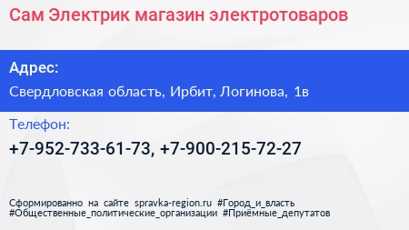 Сам Электрик, магазин электротоваров по адресу Свердловская область, Ирбит, Логинова, 1в в дальнейшем Организация, размещена в следующих категориях: