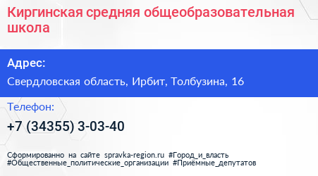 Киргинская средняя общеобразовательная школа по адресу Свердловская область, Ирбит, Толбузина, 16 в дальнейшем Организация, размещена в следующих категориях: