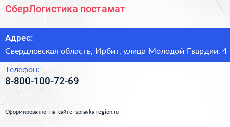 СберЛогистика, постамат по адресу Свердловская область, Ирбит, улица Молодой Гвардии, 4 в дальнейшем Организация, размещена в следующих категориях: