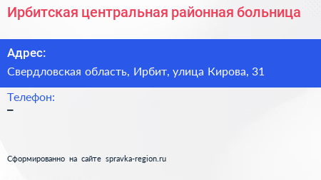 Ирбитская центральная районная больница по адресу Свердловская область, Ирбит, улица Кирова, 31 в дальнейшем Организация, размещена в следующих категориях: