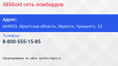585Gold, сеть ломбардов по адресу 664003, Иркутская область, Иркутск, Урицкого, 12 в дальнейшем Организация, размещена в следующих категориях: