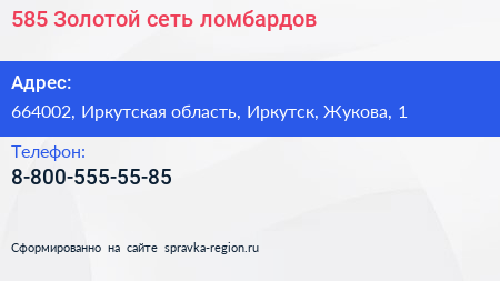 585*Золотой, сеть ломбардов по адресу 664002, Иркутская область, Иркутск, Жукова, 1 в дальнейшем Организация, размещена в следующих категориях: