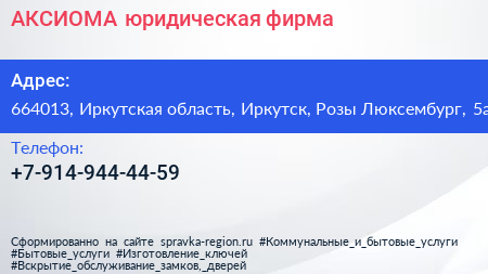 АКСИОМА, юридическая фирма по адресу 664013, Иркутская область, Иркутск, Розы Люксембург, 5а в дальнейшем Организация, размещена в следующих категориях: