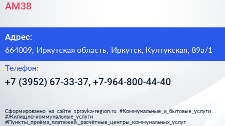 АМ38 по адресу 664009, Иркутская область, Иркутск, Култукская, 89а/1 в дальнейшем Организация, размещена в следующих категориях: