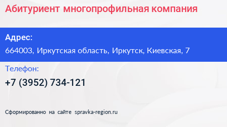 Абитуриент, многопрофильная компания по адресу 664003, Иркутская область, Иркутск, Киевская, 7 в дальнейшем Организация, размещена в следующих категориях: