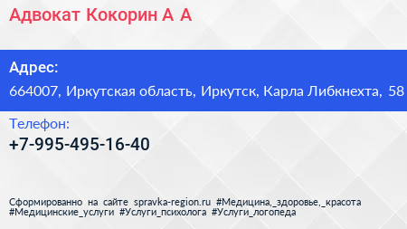 Адвокат Кокорин А.А. по адресу 664007, Иркутская область, Иркутск, Карла Либкнехта, 58 в дальнейшем Организация, размещена в следующих категориях: