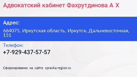 Адвокатский кабинет Фахрутдинова А.Х. по адресу 664075, Иркутская область, Иркутск, Дальневосточная, 151 в дальнейшем Организация, размещена в следующих категориях: