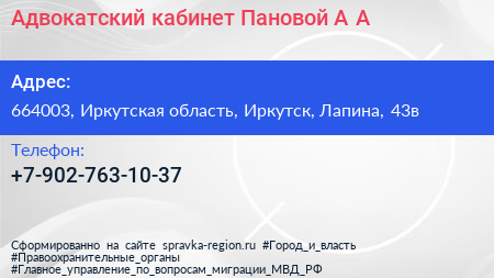 Адвокатский кабинет Пановой А.А. по адресу 664003, Иркутская область, Иркутск, Лапина, 43в в дальнейшем Организация, размещена в следующих категориях: