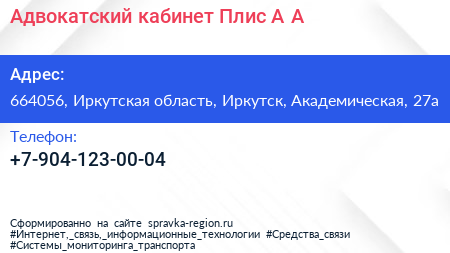Адвокатский кабинет Плис А.А. по адресу 664056, Иркутская область, Иркутск, Академическая, 27а в дальнейшем Организация, размещена в следующих категориях: