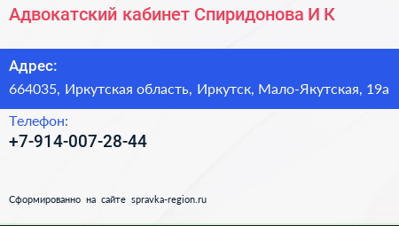 Адвокатский кабинет Спиридонова И.К. по адресу 664035, Иркутская область, Иркутск, Мало-Якутская, 19а в дальнейшем Организация, размещена в следующих категориях: