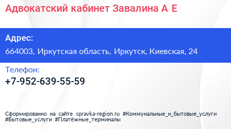 Адвокатский кабинет Завалина А.Е. по адресу 664003, Иркутская область, Иркутск, Киевская, 24 в дальнейшем Организация, размещена в следующих категориях: