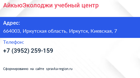 АйкьюЭколоджи, учебный центр по адресу 664003, Иркутская область, Иркутск, Киевская, 7 в дальнейшем Организация, размещена в следующих категориях: