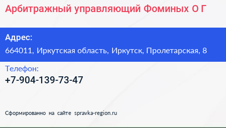 Арбитражный управляющий Фоминых О.Г. по адресу 664011, Иркутская область, Иркутск, Пролетарская, 8 в дальнейшем Организация, размещена в следующих категориях: