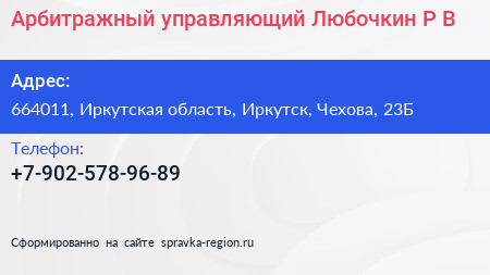 Арбитражный управляющий Любочкин Р.В. по адресу 664011, Иркутская область, Иркутск, Чехова, 23Б в дальнейшем Организация, размещена в следующих категориях: