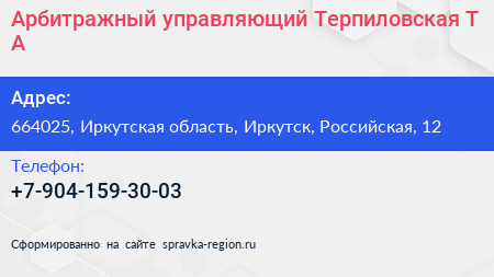 Арбитражный управляющий Терпиловская Т.А. по адресу 664025, Иркутская область, Иркутск, Российская, 12 в дальнейшем Организация, размещена в следующих категориях: