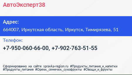 АвтоЭксперт38 по адресу 664007, Иркутская область, Иркутск, Тимирязева, 51 в дальнейшем Организация, размещена в следующих категориях: