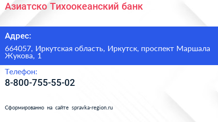Азиатско-Тихоокеанский банк по адресу 664057, Иркутская область, Иркутск, проспект Маршала Жукова, 1 в дальнейшем Организация, размещена в следующих категориях: