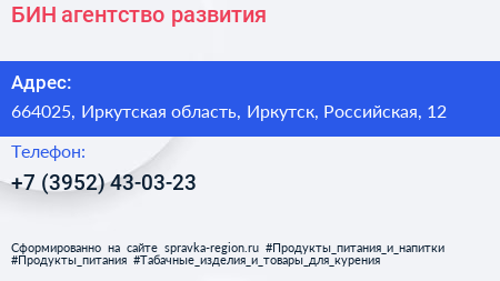 БИН, агентство развития по адресу 664025, Иркутская область, Иркутск, Российская, 12 в дальнейшем Организация, размещена в следующих категориях: