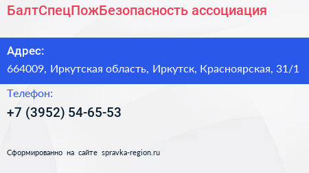 БалтСпецПожБезопасность, ассоциация по адресу 664009, Иркутская область, Иркутск, Красноярская, 31/1 в дальнейшем Организация, размещена в следующих категориях: