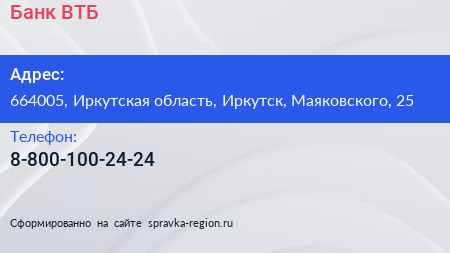 Банк ВТБ по адресу 664005, Иркутская область, Иркутск, Маяковского, 25 в дальнейшем Организация, размещена в следующих категориях: