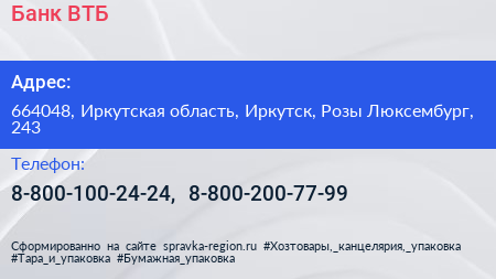 Банк ВТБ по адресу 664048, Иркутская область, Иркутск, Розы Люксембург, 243 в дальнейшем Организация, размещена в следующих категориях: