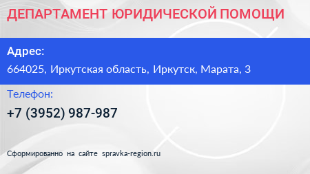 ДЕПАРТАМЕНТ ЮРИДИЧЕСКОЙ ПОМОЩИ по адресу 664025, Иркутская область, Иркутск, Марата, 3 в дальнейшем Организация, размещена в следующих категориях: