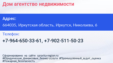 Дом, агентство недвижимости по адресу 664035, Иркутская область, Иркутск, Николаева, 6 в дальнейшем Организация, размещена в следующих категориях: