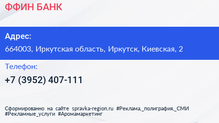 ФФИН БАНК по адресу 664003, Иркутская область, Иркутск, Киевская, 2 в дальнейшем Организация, размещена в следующих категориях: