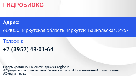 ГИДРОБИОКС по адресу 664050, Иркутская область, Иркутск, Байкальская, 295/1 в дальнейшем Организация, размещена в следующих категориях: