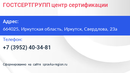ГОСТСЕРТГРУПП, центр сертификации по адресу 664025, Иркутская область, Иркутск, Свердлова, 23а в дальнейшем Организация, размещена в следующих категориях: