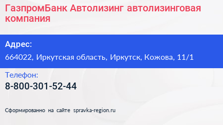 ГазпромБанк Автолизинг, автолизинговая компания по адресу 664022, Иркутская область, Иркутск, Кожова, 11/1 в дальнейшем Организация, размещена в следующих категориях:
