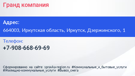 Гранд, компания по адресу 664003, Иркутская область, Иркутск, Дзержинского, 1 в дальнейшем Организация, размещена в следующих категориях: