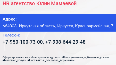 HR-агентство Юлии Мамаевой по адресу 664003, Иркутская область, Иркутск, Красноармейская, 7 в дальнейшем Организация, размещена в следующих категориях: