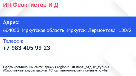 ИП Феоктистов И.Д. по адресу 664033, Иркутская область, Иркутск, Лермонтова, 130/2 в дальнейшем Организация, размещена в следующих категориях: