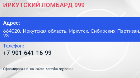 ИРКУТСКИЙ ЛОМБАРД 999 по адресу 664020, Иркутская область, Иркутск, Сибирских Партизан, 23 в дальнейшем Организация, размещена в следующих категориях:
