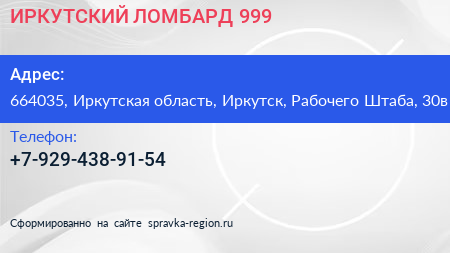 ИРКУТСКИЙ ЛОМБАРД 999 по адресу 664035, Иркутская область, Иркутск, Рабочего Штаба, 30в в дальнейшем Организация, размещена в следующих категориях: