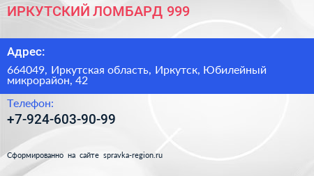 ИРКУТСКИЙ ЛОМБАРД 999 по адресу 664049, Иркутская область, Иркутск, Юбилейный микрорайон, 42 в дальнейшем Организация, размещена в следующих категориях: