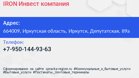 IRON Инвест, компания по адресу 664009, Иркутская область, Иркутск, Депутатская, 89а в дальнейшем Организация, размещена в следующих категориях: