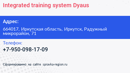 Integrated training system Dyaus по адресу 664017, Иркутская область, Иркутск, Радужный микрорайон, 71 в дальнейшем Организация, размещена в следующих категориях: